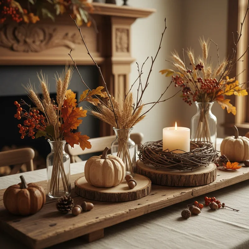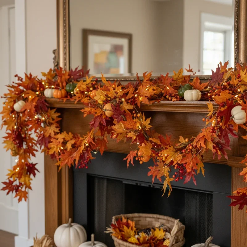 String together preserved autumn leaves to create garlands that bring the outdoors inside with all the beauty and none of the mess. Use real leaves preserved with glycerin or high-quality silk leaves for garlands that maintain their color throughout the season. Drape them along mantels, wind them through stair railings, or swag them across doorways for cohesive autumn touches throughout your home. Mix leaf types and colors for natural variation that mimics actual fall foliage in your region. Add battery-operated micro lights woven through the garland for evening ambiance that creates warm, welcoming spaces. The movement and flow of garlands soften architectural lines while adding organic shapes to structured spaces. This versatile decoration scales to any space, from tiny apartment nooks to grand staircases.
