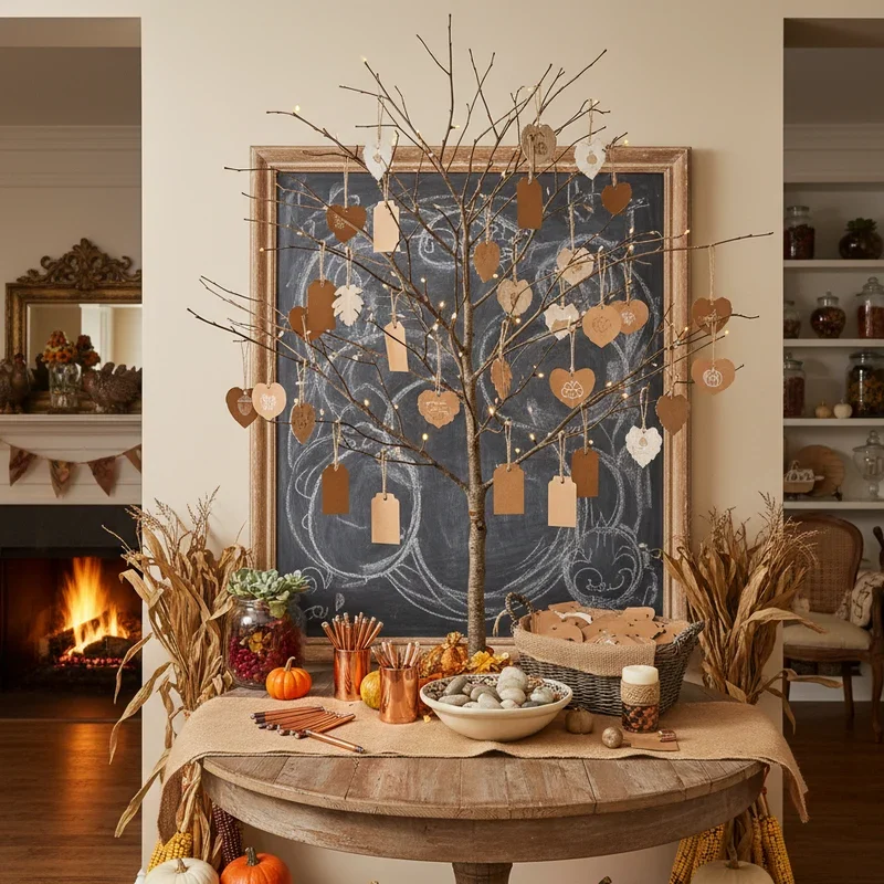 Set up a gratitude tree that serves as both decoration and meaningful activity, encouraging guests to reflect on their blessings. Use a large branch secured in a weighted vase or create a small potted tree with bare branches perfect for hanging notes. Provide autumn-colored paper leaves and metallic pens so guests can write what they're thankful for throughout the gathering. Position this interactive decoration in your entryway or living room where it becomes a conversation starter and ongoing activity. As the day progresses, watch your tree bloom with gratitude, creating a beautiful visual representation of collective thankfulness. Kids especially love participating, and reading the notes aloud can become a touching new tradition. After Thanksgiving, preserve special notes in a scrapbook to revisit in future years, building a family gratitude archive.