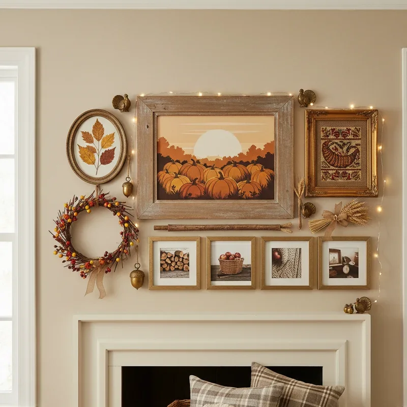 Create a temporary gallery wall celebrating family, gratitude, and autumn beauty using a mix of photos, prints, and dimensional objects. Include family photos from past Thanksgivings, autumn landscape prints, and gratitude quotes in coordinating frames for cohesive look. Add dimensional elements like small shelves holding mini pumpkins or preserved leaves in shadow boxes for visual interest. Use removable adhesive strips to protect walls while allowing easy installation and removal after the holiday. This personalized decoration becomes a conversation starter and memory lane journey for family gatherings. Mix frame sizes and orientations for dynamic arrangement that feels collected over time rather than purchased as set. Update annually with new photos and quotes, building a growing collection of Thanksgiving memories.
