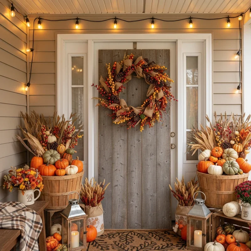 Set the thankful tone before guests enter with a front porch display that celebrates autumn's bounty and welcomes visitors warmly. Flank your door with corn stalks tied to porch posts, creating height that frames your entrance dramatically. Layer pumpkins and mums in graduated sizes on steps or in clusters near the door for abundant harvest feeling. Add a welcome sign with Thanksgiving message or family name for personalized touch that makes guests feel expected and valued. Include lanterns with battery-operated candles for evening glow that guides guests safely to your door. A festive doormat and wreath complete the welcoming vignette that extends your hospitality beyond your home's walls. Weather-resistant elements ensure your display looks fresh throughout the holiday season despite autumn storms.