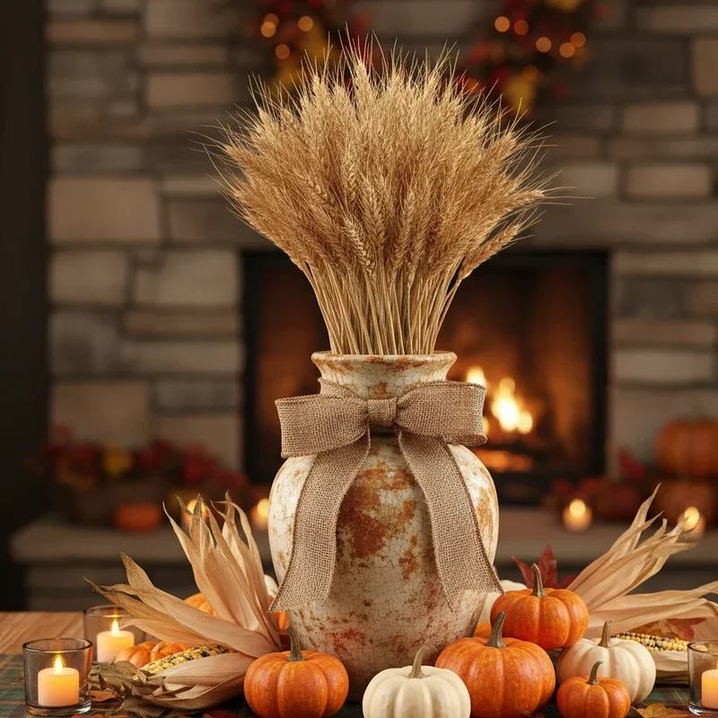 Incorporate wheat bundles throughout your home for a classic harvest element that adds vertical interest and golden warmth. Tie bundles with velvet ribbon and hang them on doors, or place them in tall vases for instant autumn arrangements. The natural golden color of wheat complements any color scheme while adding texture that softens modern spaces. Mix wheat with other dried grasses like pampas grass or bunny tails for varied heights and textures. Small wheat bundles make elegant napkin rings when tied with twine, connecting your table setting to larger room decorations. The vertical lines of wheat draw eyes upward, making rooms feel taller and more spacious. These dried arrangements last throughout the fall season and can be composted afterward, making them an eco-friendly choice.
