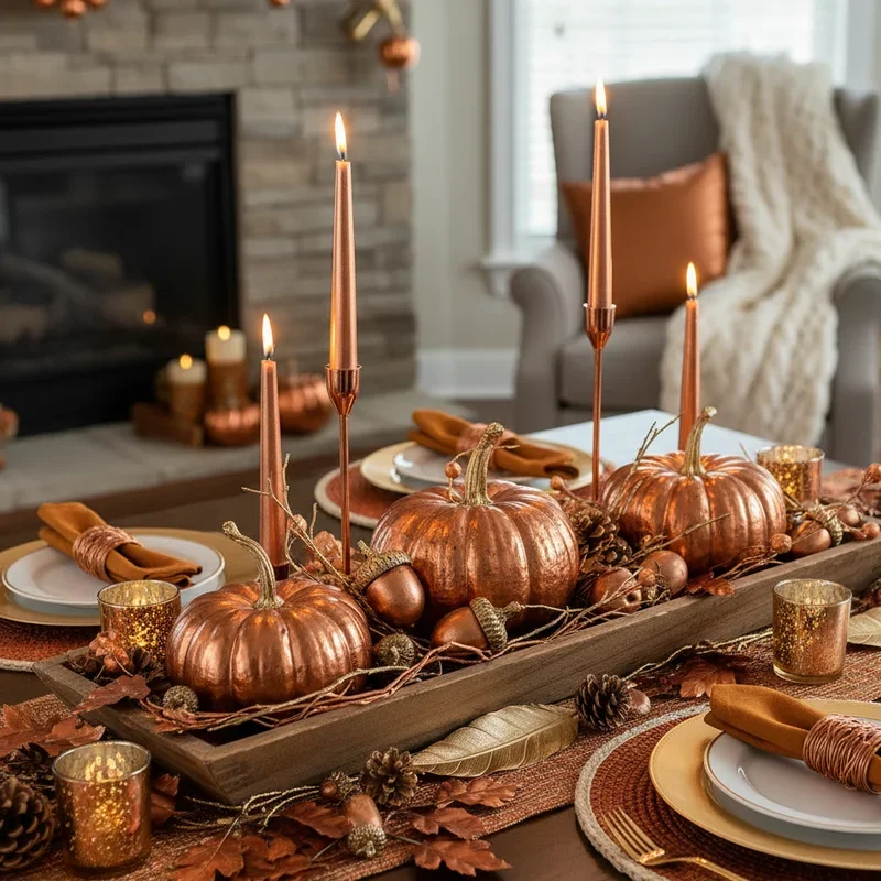 Elevate your Thanksgiving decor with metallic touches that add glamour without going overboard into Christmas territory. Incorporate copper moscow mule mugs as vases for autumn flowers or candle holders for elegant table settings. Spray paint pumpkins and pinecones in gold for sophisticated accents that catch candlelight beautifully throughout evening gatherings. Mix copper chargers under dinner plates for layered place settings that feel special occasion without being fussy. The warm metallic tones complement autumn's natural palette while adding reflective surfaces that amplify light. Use metallic ribbon to tie napkins or bundle wheat sheaves for cohesive touches throughout your decorating. These elegant accents transition perfectly from Thanksgiving through New Year's celebrations, maximizing their decorative value.