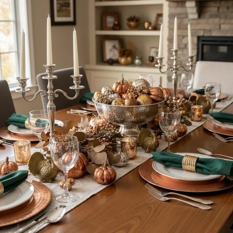 Add sophisticated shine with metallic elements that catch light and create visual interest without overwhelming your table's warmth. Mix metals like copper, bronze, and rose gold for rich autumn metallics that complement rather than compete. Use metallic chargers, napkin rings, or flatware to add glamour while maintaining practical functionality. Spray paint natural elements like acorns, leaves, or pinecones with metallic paints for budget-friendly elegance. Include mercury glass votives or vases that provide vintage metallic charm with romantic patina. Add metallic ribbon accents to napkins, centerpieces, or chair backs for cohesive shimmer throughout. Position metallic elements where they'll catch candlelight or natural light for maximum impact. This subtle sparkle elevates your table from everyday to special occasion while maintaining Thanksgiving's warm, welcoming essence rather than cold formality.