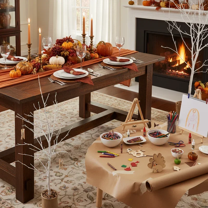 Design a children's table that keeps young guests engaged while maintaining Thanksgiving's festive spirit through fun, interactive elements. Cover the table with kraft paper and provide crayons for tablecloth doodling, creating an evolving artwork throughout dinner. Use colorful disposable plates and cups to prevent breaking accidents while maintaining cheerful aesthetics. Create turkey-shaped place cards with each child's name and fun facts about Thanksgiving they can share. Include small crafting supplies for making pilgrim hats or Indian headdresses between courses. Position a gratitude jar where kids write what they're thankful for on colorful paper strips. Add chocolate turkeys or candy corn cups as edible decorations they can enjoy after dinner. This playful approach keeps children entertained and included in celebrations, teaching gratitude through age-appropriate activities that make them excited about participating in family traditions.
