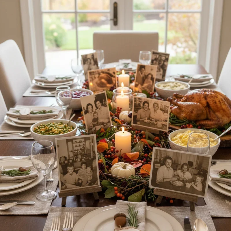 Create a nostalgic journey through family history by incorporating photographs that celebrate generations of grateful gatherings. Display vintage family Thanksgiving photos in mismatched frames along the table's center, creating a timeline of gratitude. Scan and print old recipes in grandparents' handwriting as place mats, protecting them with clear covers. Create photo napkin rings by wrapping small pictures around napkin rolls with ribbon. Design a photo garland stretching above the table featuring family members who can't attend this year. Include baby photos of all guests for a fun guessing game between courses. Position a large frame where guests can write grateful messages around a current family photo. This personal approach makes your table uniquely yours, honoring those who came before while creating new memories that'll join future displays.