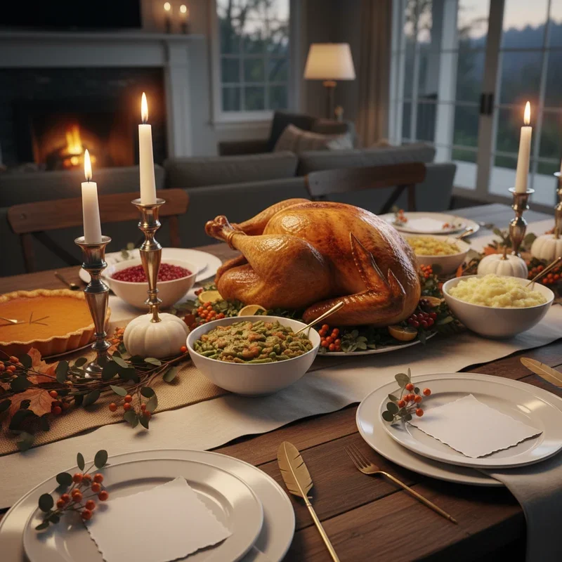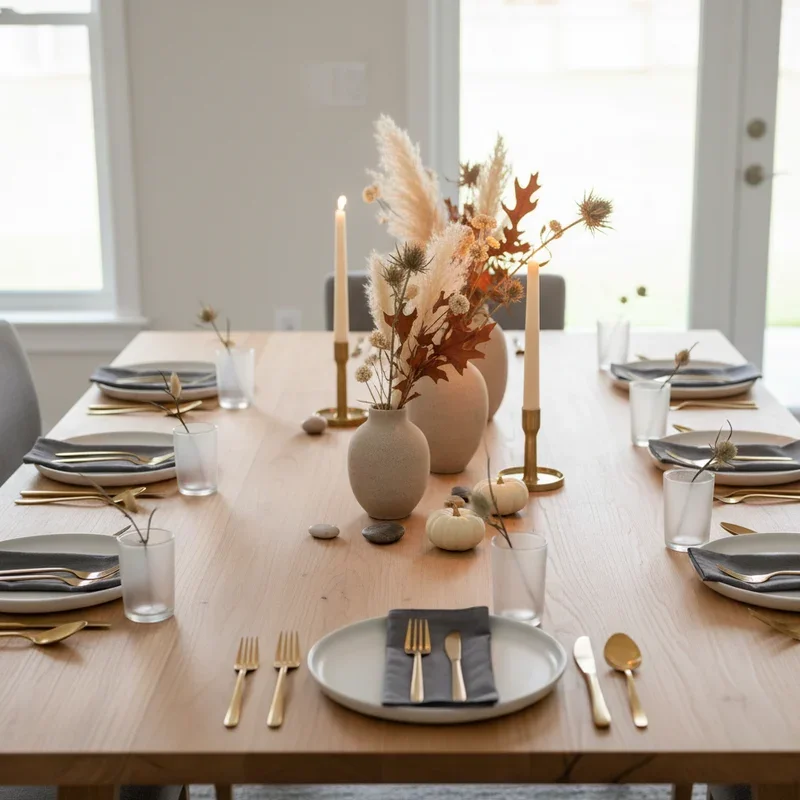 Prove that less can be more with a clean, modern approach that lets gratitude speak louder than decoration. Choose a crisp white or grey tablecloth as your canvas, adding single stems of wheat or eucalyptus in slim vases for understated elegance. Use white plates with simple gold or black rim details, paired with matte black or brushed gold flatware for contemporary contrast. Create place cards from small white pumpkins with names written in modern calligraphy using black markers. Include geometric candle holders in metals or concrete for industrial touches that maintain simplicity. Add one statement piece like an oversized white ceramic turkey or abstract sculpture representing abundance. This refined aesthetic appeals to those who find beauty in simplicity, proving that Thanksgiving tables don't need overwhelming decoration to create meaningful atmosphere and memorable moments.