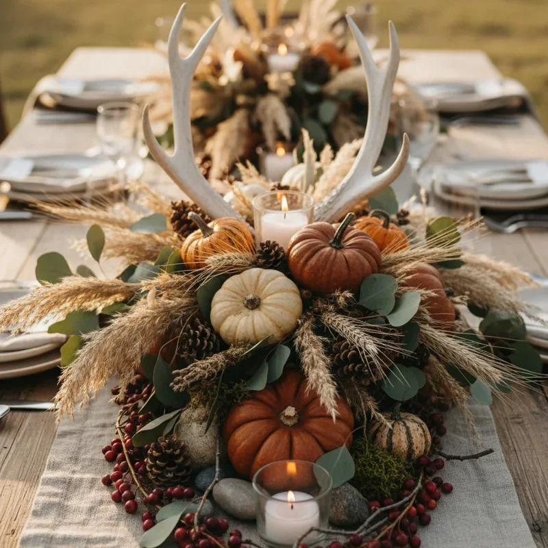 Bring the outdoors inside with centerpieces that celebrate nature's bounty using materials gathered from your own backyard or local farmer's market. Create a stunning focal point with a wooden dough bowl filled with pinecones, acorns, chestnuts, and colorful fall leaves you've pressed and preserved. Arrange branches of bittersweet, rose hips, or pyracantha berries in tall vases at varying heights for vertical interest. Include bird's nests, interesting twigs, and pieces of bark for textural variety that invites closer inspection. Add fresh herbs like sage, thyme, and rosemary for fragrance that complements dinner aromas. Position river rocks or interesting stones as natural place card holders with names written in gold paint. This organic approach connects your celebration to the harvest season's essence, reminding everyone that Thanksgiving originated from gratitude for nature's abundance and the earth's generous provisions.