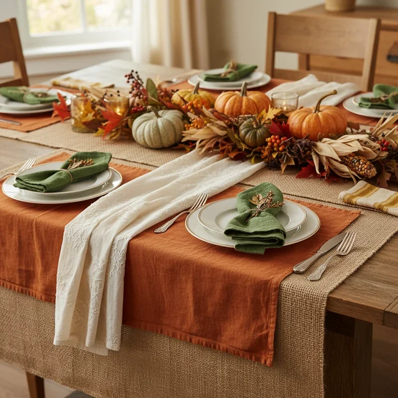 Build visual depth and tactile richness through strategic layering of different fabrics that invite touch and create comfort. Start with a quality tablecloth base, adding runners perpendicular or diagonal for unexpected angles. Layer placemats over runners, choosing different textures like woven grass, quilted fabric, or beaded designs. Use cloth napkins in complementary but not matching patterns, showing intentional coordination without matchy-matchy uniformity. Add texture through velvet ribbon, lace doilies under centerpieces, or fringed accents on table edges. Include throw pillows on dining chairs that echo table textiles for cohesive comfort. Drape a beautiful throw over the host's chair back for after-dinner coziness. This textile abundance creates a sensory experience that makes guests want to linger, feeling embraced by layers of comfort that encourage long, grateful conversations.