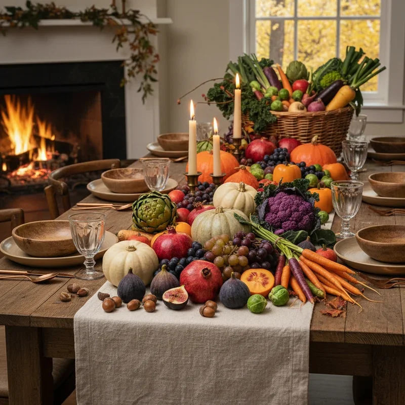 Let produce become art by arranging colorful fruits and vegetables as edible decorations that celebrate harvest abundance. Create height with artichoke or ornamental cabbage "flowers" in tall vases alongside traditional blooms. Hollow out mini pumpkins, squashes, or apples to use as unique votive holders or small flower vases. Arrange pomegranates, persimmons, and pears in wooden bowls for jewel-toned displays guests can enjoy after dinner. Use Brussels sprouts on stems, rainbow carrots, or purple cauliflower for unexpected vegetable beauty. Stack different colored corn cobs in glass cylinders for vertical interest with agricultural appeal. Include citrus fruits studded with cloves for aromatic elements that preview dessert possibilities. This approach celebrates the literal fruits of harvest, making your decorations both beautiful and practical as they can transition from decor to meal ingredients.