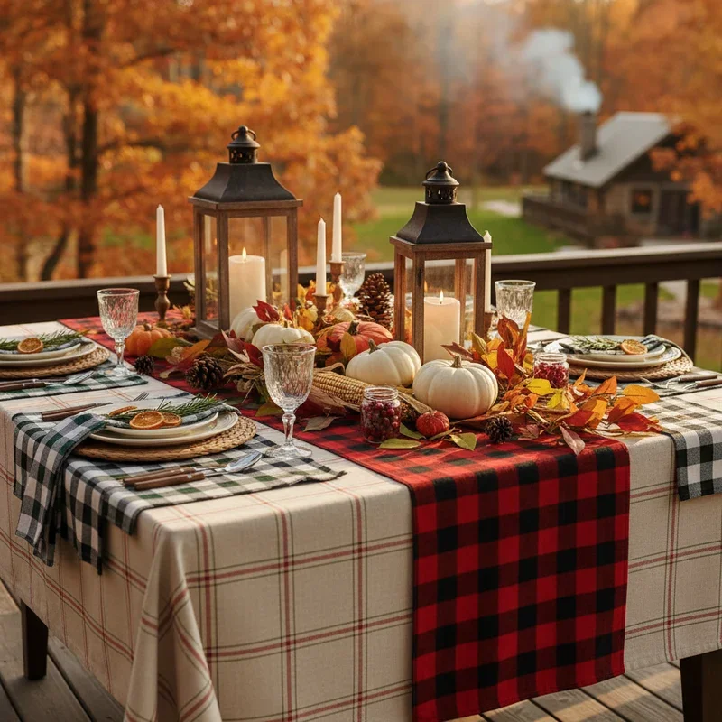 Introduce cozy cabin vibes with plaid patterns that make your table feel like a warm hug on a crisp autumn day. Layer different plaid scales through table runners, napkins, and ribbon accents, mixing traditional red and black buffalo check with softer brown and cream variations. Use plaid napkins rolled with leather or twine napkin rings for rustic charm. Incorporate plaid ribbon around candle bases, tied to chair backs, or woven through centerpiece elements. Add solid-colored dishes that pick up plaid tones without competing patterns. Include plaid-wrapped vases or mason jars for flower arrangements that maintain theme consistency. Balance patterns with solid textures like wood and metal to prevent visual overwhelm. This pattern play brings warmth and casual comfort that encourages guests to relax and enjoy rather than worry about formality.