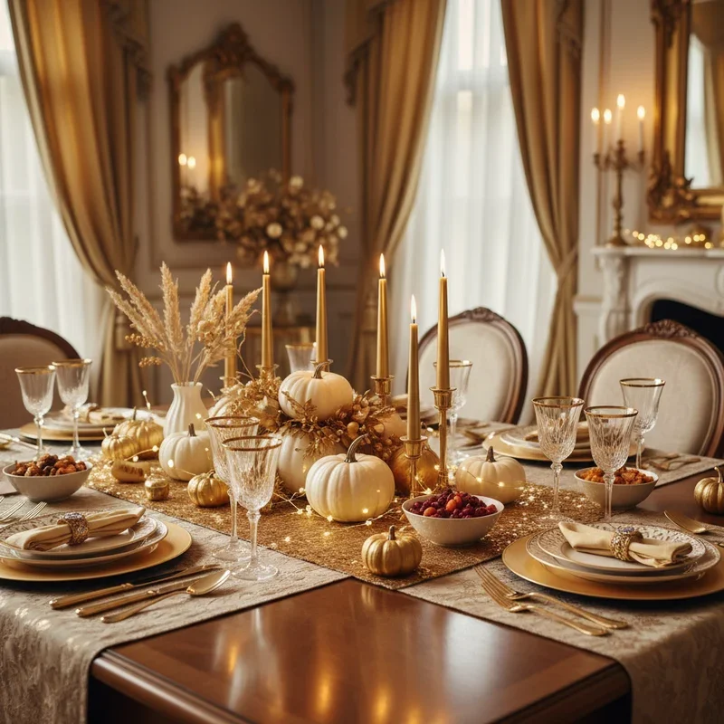 Elevate your Thanksgiving feast with luxurious gold accents that make every guest feel like royalty at your gratitude gala. Layer gold charger plates beneath ivory dinner plates, adding gold-rimmed glassware that catches candlelight like liquid sunshine. Spray paint mini pumpkins and pine cones in metallic gold, arranging them among ivory candles of varying heights for dimensional elegance. Use gold flatware or tie regular silverware with gold velvet ribbons for instant upgrade appeal. Create napkin rings from gold wire twisted with tiny pearls or crystals for extra sparkle. Include gold-dusted eucalyptus or gold-painted magnolia leaves in your centerpiece for natural elements with glamorous twists. This opulent approach proves Thanksgiving can be both grateful and gorgeous, showing appreciation through beautiful presentation that makes the traditional feast feel like a five-star restaurant experience.