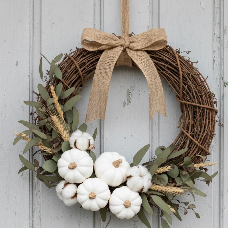 Create modern elegance with a minimalist wreath featuring white pumpkins and subtle natural elements in a neutral palette. Attach small white foam or artificial pumpkins sparingly around a simple twig or white-painted grapevine wreath. Add bleached or white-painted pinecones for texture without color distraction. Include preserved silver dollar eucalyptus or dusty miller for soft grey-green accents. Incorporate white berries or cotton bolls for additional neutral elements that maintain the monochromatic scheme. Use white or cream ribbon sparingly, perhaps just a small bow or trailing ends. Add one unexpected element like a single orange berry cluster for modern contrast. This sophisticated approach appeals to contemporary aesthetics while maintaining Thanksgiving's essential warmth through texture and form rather than color.
