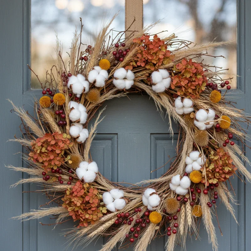 Design a soft, romantic Thanksgiving wreath using cotton bolls and dried flowers in muted autumn tones. Arrange cotton stems with open bolls showing fluffy white cotton throughout your wreath base. Add dried hydrangeas, strawflowers, and globe amaranth in dusty rose, cream, and pale orange. Include dried grasses like pampas or bunny tails for movement and texture variation. Incorporate preserved eucalyptus or dusty miller for silvery green accents that complement the soft palette. Add small white pumpkins or cream-colored berries for seasonal elements. Tie with a silk ribbon in blush or champagne for elegant finishing. This gentle approach offers a feminine alternative to traditional bold autumn colors while maintaining Thanksgiving's warmth and welcoming spirit.