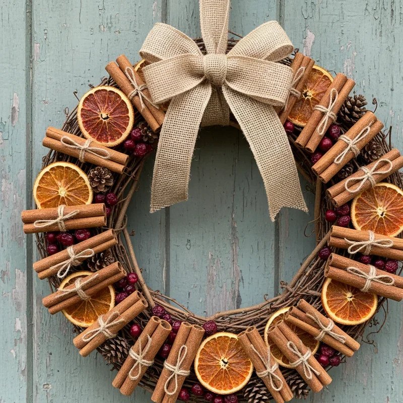 Engage multiple senses with an aromatic wreath combining cinnamon sticks and dried orange slices for natural fragrance. Bundle cinnamon sticks in groups of three or five, securing with twine or ribbon. Arrange bundles in a starburst pattern or uniform direction around your wreath base. Intersperse dried orange slices, some whole and others halved for variety. Add star anise, whole cloves, and bay leaves for additional aromatic elements. Include dried apple slices and cranberries for color variation within the warm palette. Tie with a burnt orange velvet ribbon that complements the spice tones perfectly. This scented wreath provides natural aromatherapy that welcomes guests with Thanksgiving's signature fragrances, creating an immersive sensory experience before they enter.