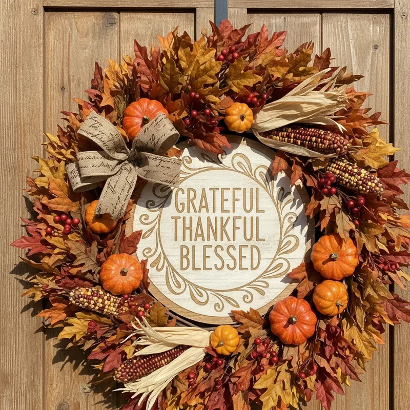 Center your wreath design around Thanksgiving's core message with prominent gratitude-focused signage surrounded by seasonal elements. Choose or create a wooden, metal, or fabric sign featuring "Grateful, Thankful, Blessed" or similar thanksgiving message. Build your wreath around this centerpiece using complementary colors that don't overwhelm the text. Add fall leaves, small pumpkins, and berries that frame rather than hide your message. Include battery-operated lights to illuminate the sign during evening hours. Incorporate family photos or thankful notes tucked among decorations for personal touches. Use natural elements that echo your sign's material, like twigs for wooden signs or metallic leaves for metal signs. This message-forward approach immediately communicates your home's gratitude attitude, setting a thankful tone for all who arrive.