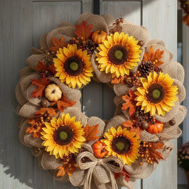 Merge rustic charm with sunny brightness by combining burlap textures with cheerful sunflowers in your Thanksgiving wreath. Wrap a wire wreath form with burlap ribbon, creating loops and gathers for dimensional texture. Attach artificial sunflower heads of varying sizes, positioning larger blooms as focal points. Include small wheat bundles and cotton bolls between flowers for farmhouse authenticity. Add miniature scarecrows or crow figurines for whimsical storytelling elements. Incorporate dried corn husks shaped into bows or flowers for additional texture. Use a plaid ribbon accent that ties together the rustic and bright elements perfectly. This design bridges summer's end and autumn's beginning, creating a welcoming entrance that radiates warmth and hospitality throughout the Thanksgiving season.