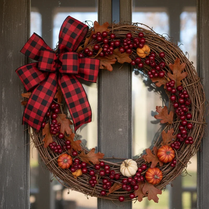 Combine timeless plaid patterns with rich berry clusters for a wreath that bridges Thanksgiving and the approaching holiday season. Choose a warm plaid ribbon in oranges, reds, and browns rather than Christmas colors. Create large bow focal points or weave ribbon throughout your evergreen or grapevine base. Add clusters of artificial berries in burgundy, orange, and gold for color depth. Include small pinecones, acorns, and preserved leaves for textural interest between berry clusters. Incorporate pheasant feathers or small artificial birds for traditional hunting season references. Add subtle metallic accents through gold-painted pinecone tips or copper wire details. This versatile design transitions beautifully from Thanksgiving through winter, making it a practical choice for extended seasonal decorating.