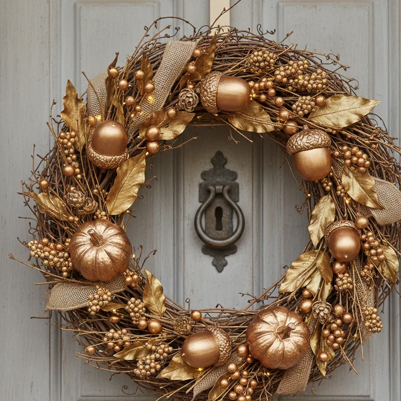 Elevate your Thanksgiving entrance with a glamorous wreath featuring metallic finishes that catch and reflect autumn light. Spray paint natural elements like leaves, acorns, and pinecones in gold, copper, and bronze tones. Layer metallic elements with preserved natural items for balance between glamour and organic beauty. Include metallic ribbon woven throughout for cohesive shimmer that ties elements together. Add glass or acrylic ornaments in warm metallics for additional light play. Incorporate white or cream elements to prevent the design from feeling too heavy. Use battery-operated copper wire lights for subtle illumination that enhances metallic elements. This upscale approach proves Thanksgiving decorations can be both seasonal and sophisticated, perfect for formal dinner hosts.