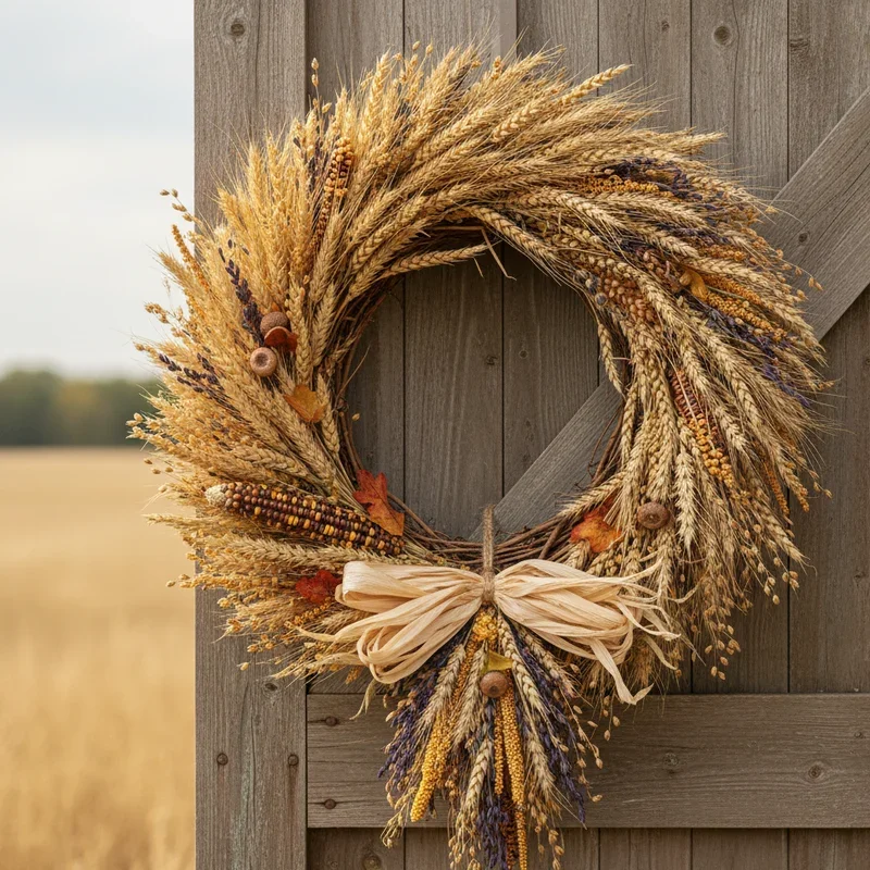 Celebrate the agricultural roots of Thanksgiving with a wreath composed entirely of golden grains that shimmer in autumn sunlight. Bundle wheat, barley, oats, and rye in small groupings, securing each with twine before attaching to your wreath form. Arrange bundles in the same direction for a windswept look or alternate directions for fuller appearance. Add dried lavender or small wildflowers for subtle color without overwhelming the golden palette. Incorporate a few stalks of ornamental corn for textural interest and color pops. Tie everything together with a wide burlap bow featuring wire edges for shape retention. This understated elegance appeals to minimalist sensibilities while honoring farming traditions that made the first Thanksgiving possible, creating a sophisticated welcome that works from early November through the holiday.